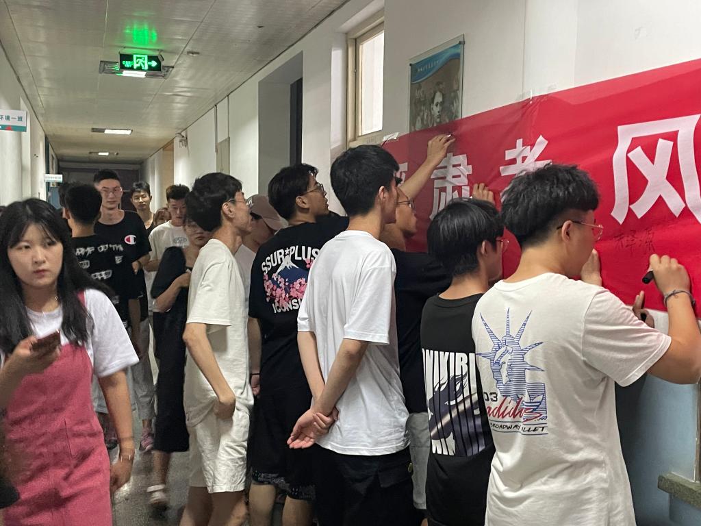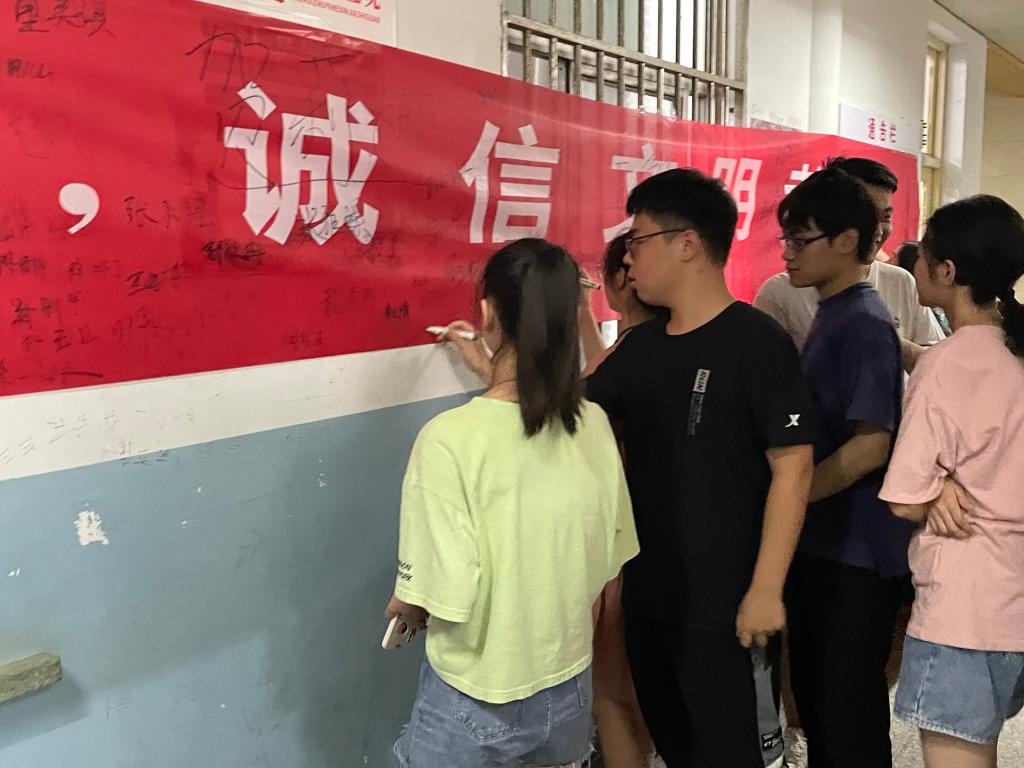 活动开始前,我系学习部的同学提前搭建好了签字平台,同学们纷纷在诚信考试承诺书上签下了自己的名字,并表示自己会遵守考试纪律,诚信应考,积极备考,创造一个公平公正的考试环境。诚实守信是中华民族的传统美德,也是当代大学生基本的道德行为准则,签名中蕴含着大家对自己诚信考试的承诺。满满的签名无一不展现着我系学子积极向上、诚实守信的良好风貌,这上面的每一个名字,都值得赞扬,都值得珍藏。
